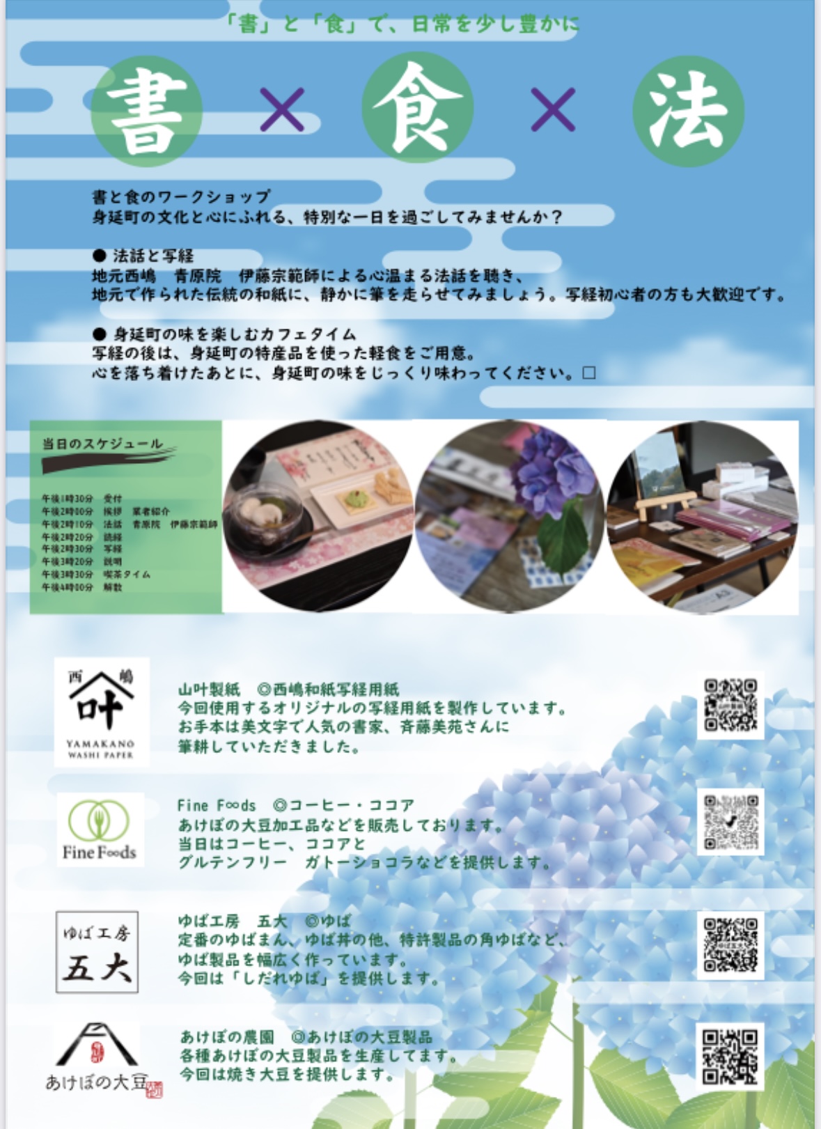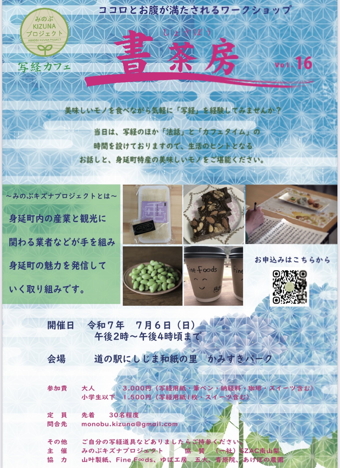 日頃より道の駅にしじま和紙の里かみすきパークを ご利用いただきありがとうございます。 7月6日(日)にイベントを開催いたします。 7・6 14:00~ みのぶKiZUNAプロジェクト主催 書茶房 vol16 を開催! ココロとお腹が満たされるワーショップ